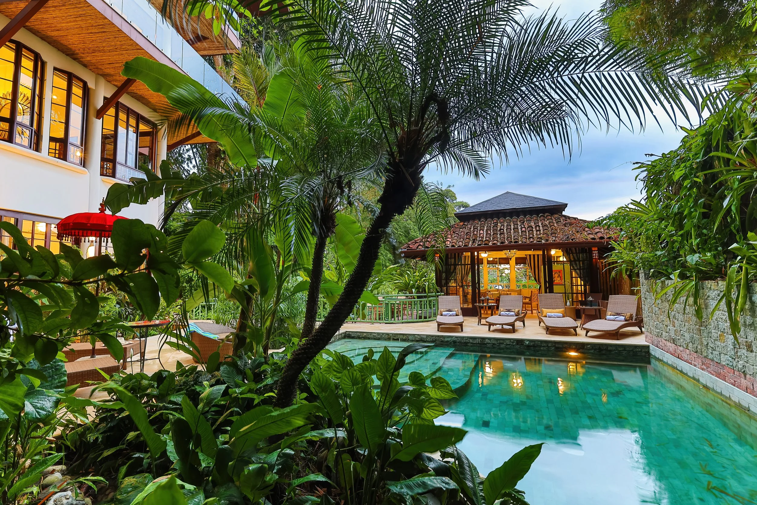 Crystal-clear pool surrounded by tropical gardens